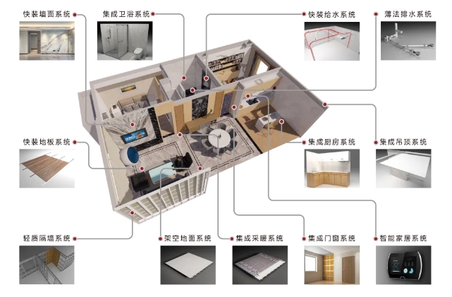和能裝配式裝修智能建造技術(shù)通過工業(yè)化生產(chǎn)的方式把獨(dú)立出來的內(nèi)裝修轉(zhuǎn)化為可批量生產(chǎn)的部品,并且通過連接構(gòu)造設(shè)計(jì)實(shí)現(xiàn)現(xiàn)場裝配。具體包括全屋部品體系,即快裝墻面系統(tǒng)、快裝給水系統(tǒng)、薄法排水系統(tǒng)、集成衛(wèi)浴系統(tǒng)、套裝門窗系統(tǒng)、集成吊頂系統(tǒng)、輕質(zhì)隔墻系統(tǒng)、快裝地板系統(tǒng)、架空地面系統(tǒng)、集成采暖系統(tǒng)、集成廚房系統(tǒng)、智能家居系統(tǒng)。