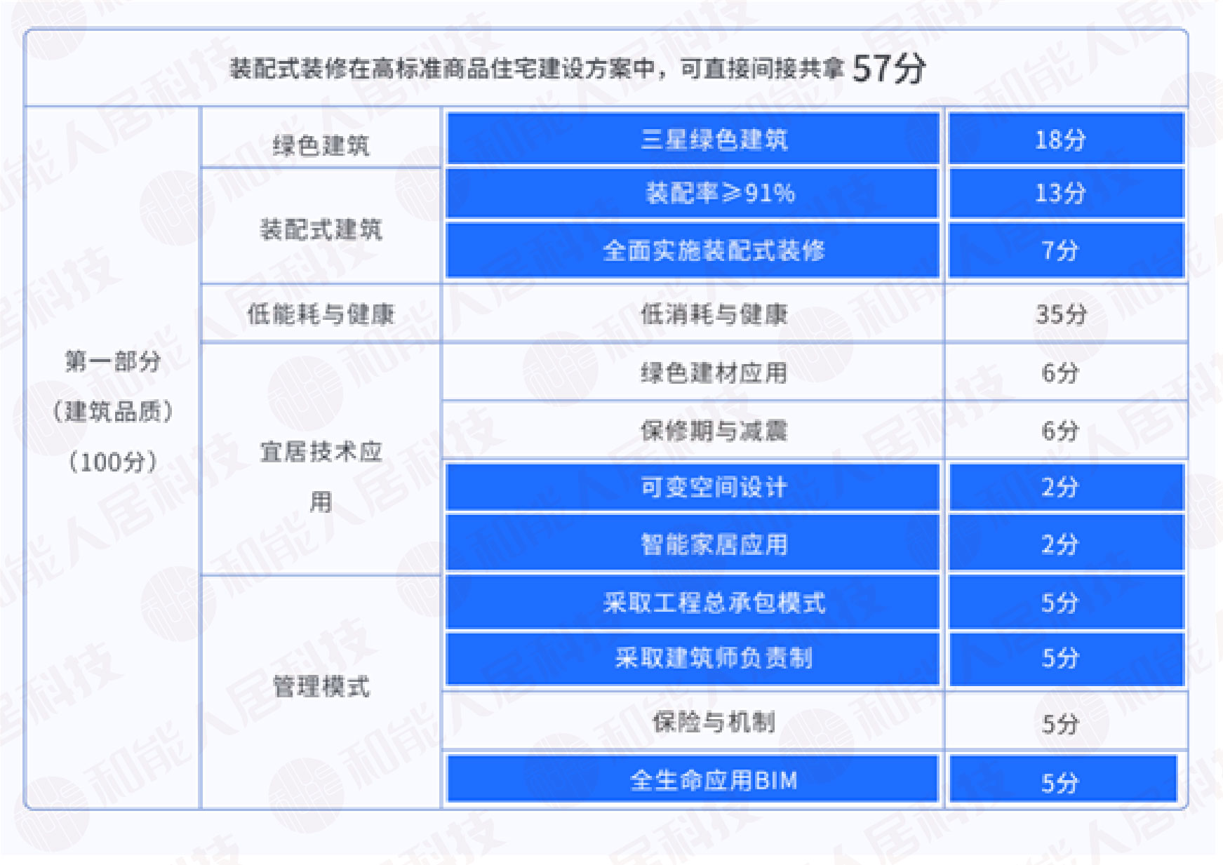 從首輪出讓條件的高標準評分表來看,裝配式建筑板塊,裝配式裝修不僅在全面實施裝配式裝修項直接拿7分,在91%裝配率方面直間接可拿到48%的裝配率。在整體建筑品質部分的100分中,裝配式裝修可直接、間接助力高標準商品住宅建筑品質拿57分,在高標準商品住宅評分標準中有著舉足輕重的作用。